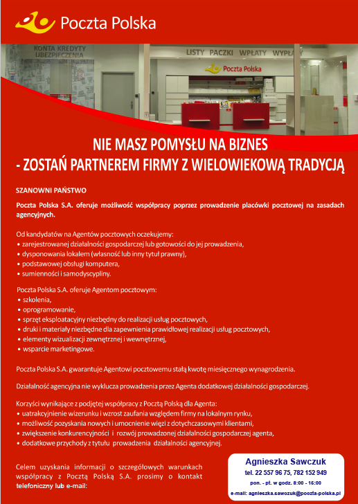 Poczta Polska S.A., w której strukturze działa Region Sieci Warszawa-Województwo, poszukuje na terenie gmin miejskich oraz miejsko- wiejskich osób chętnych do nawiązania współpracy, która polegałaby na prowadzeniu Agencji Pocztowej.