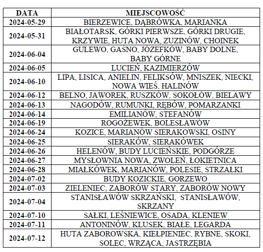 Informujemy, że Urząd Gminy Gostynin podał terminy odbioru odpadów wielkogabarytowych na rok 2024. Właściciele nieruchomości oraz osoby zgłaszające odpady remontowo-budowlane powinni zwrócić uwagę na poniższy harmonogram.