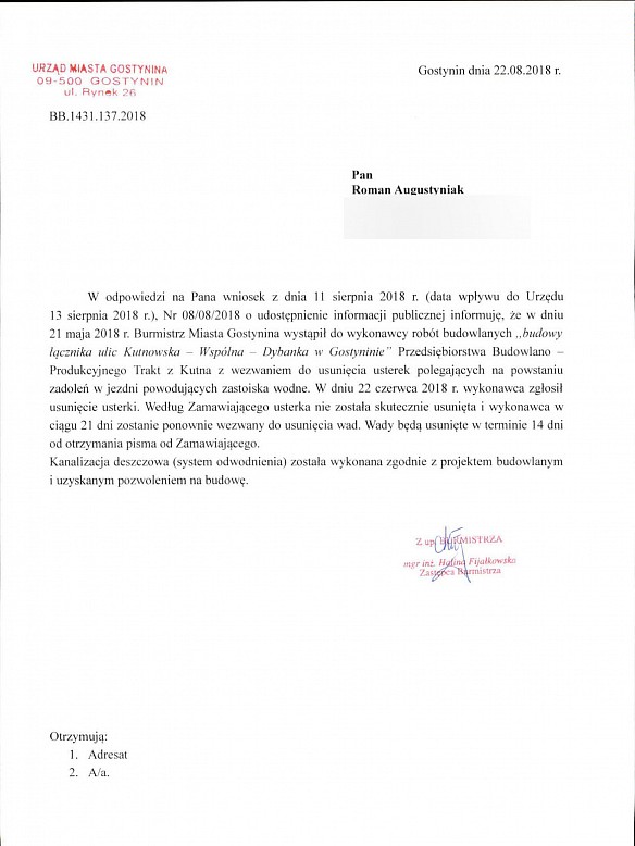 W odpowiedzi podpisanej przez Zastępce Burmistrza Halinę Fijałkowską czytamy - "Burmistrz Miasta Gostynina wystąpił do wykonawcy robót budowlanych "budowy łącznika ulic Kutnowska - Wspólna - Dybanka w Gostyninie" Przedsiębiorstwa Budowlano - Produkcyjnego Trakt z Kutna z wezwaniem do usunięcia usterek polegających na powstaniu zadoleń w jezdni powodujących zastoiska wodne. W dniu 22 czerwca 2018 r. wykonawca zgłosił usunięcie usterki. Według Zamawiającego usterka nie została skutecznie usunięta i wykonawca w ciągu 21 dni zostanie ponownie wezwany do usunięcia wad. Wady będą usunięte w terminie 14 dni od otrzymaniu pisma od Zamawiającego."