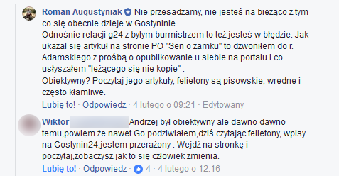 W dniu 17 listopada odbyła się rozprawa sądowa dotycząca pozwu autorstwa redaktora i właściciela www.gostynin24.pl Andrzeja Adamskiego złożonego wobec Romana Augustyniaka. Właściciel gostynin24.pl zarzucił pozwanemu naruszenie jego dóbr osobistych, tym iż Roman Augustyniak oznajmił na fanpage'u Plan dla Gostynina, że "Andrzej Adamski pisze często kłamliwe felietony" - pisownia oryginalna z pozwu. We wtorek nastąpiło ogłoszenie wyroku, Sąd Okręgowy w Płocku oddalił powództwo.