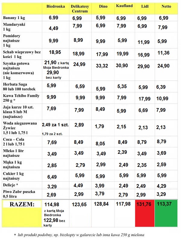 Po raz ósmy przeprowadziliśmy badanie i po raz szósty najtańszy okazał się ten sam sklep – sieci Netto (dawniej Tesco) przy ul. Jana Pawła II bądź na ulicy Legionów Polskich w Gostyninie – cena 113,37 zł. Również w ubiegłym roku, jeśli ktoś nie posiadał karty w Biedronce, najtańsze zakupy mógł zrobić w Netto.