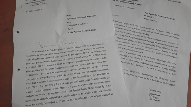 Przypomnę, że chodzi m.in. o skierowane do Prokuratury stanowisko radnych powiatowych (Agnieszka Korajczyk-Szyperska, Kazimierz Majchrzak) w sprawie umorzenia w dniu 08 kwietnia 2016 r. przez Prokuratora Okręgowego w Płocku śledztwa o sygnaturze akt V Ds. 54/14/5, dotyczącego nieprawidłowości przy realizacji inwestycji Centralny Park,Rekreacji Balneologi, Turystyki i Wypoczynku „Termy Gostynińskie”, na skutek których to nieprawidłowości Gmina Miasta Gostynina poniosła szkodę w rozmiarze nie mniejszym niż 7.665.001,30 zł.