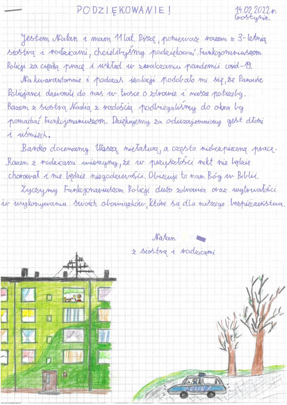Na ręce Komendanta Powiatowego Policji w Gostyninie wpłynęły podziękowania od 11-latka dla miejscowych policjantów za okazaną troskę w czasie sprawdzania przez nich osób będących w izolacji.