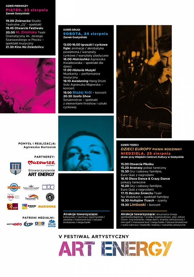 W piątkowy wieczór (23 sierpnia br.) na zamku gostynińskim rozpoczęła się jubileuszowa, piąta już edycja festiwalu artystycznego Art Energy. Jego organizatorem festiwalu od początku istnienia jest Agnieszka Bartosiak. W tym roku program wydarzenia obejmuje trzy dni koncertów, spektakli, pokazów ognia oraz wiele atrakcji dla dzieci i dorosłych.