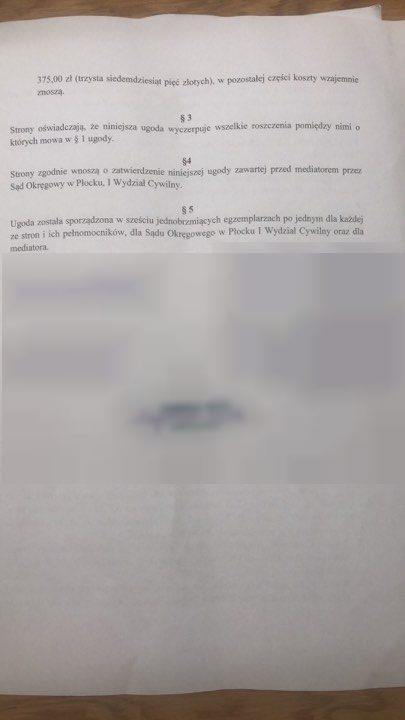 22 maja 2019 r. za pośrednictwem mediatora Sądu Okręgowego w Płocku zawarto ugodę, a jej przedmiotem jest uregulowanie wzajemnych roszczeń w pozwie o ochronę dóbr osobistych, zawisłej przed Sądem Okręgowym w Płocku I Wydział Cywilny, zarejestrowanej pod sygn. akt. IC 1320/18.